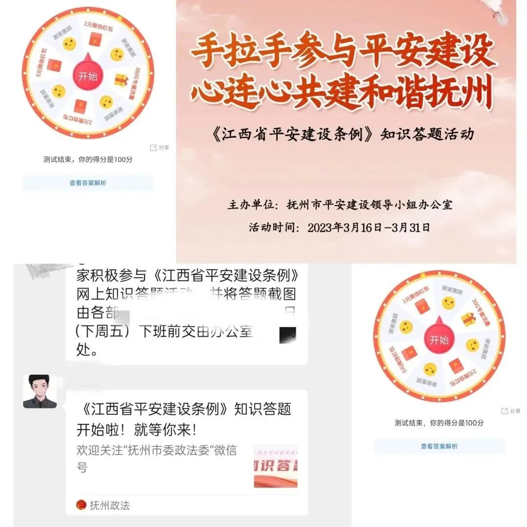 积极开展网上答题活动,借助单位微信群,组织干警参与“《江西省平安建设条例》网上答题”活动,学考结合,进一步巩固平安法治知识。