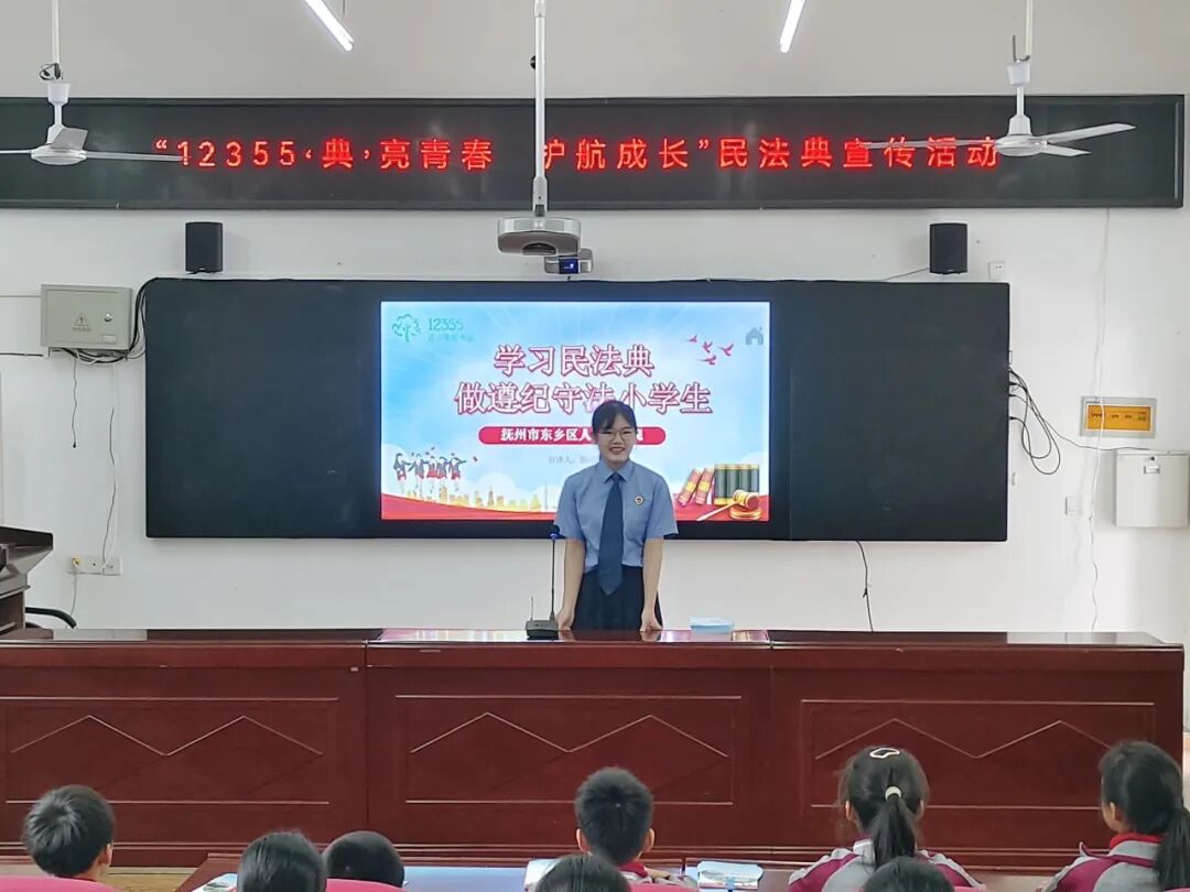 东乡区人民检察院法治副校长走进东乡二小、圩上桥小学、王桥小学等城乡学校,为同学们带来“学习民法典,做遵纪守法小学生”法治课。法治副校长通过生动形象的课件和通俗易懂的语言对《民法典》的主要内容进行了讲解,结合未成年人直播打赏、买游戏皮肤、打架斗殴等故事和案例,向师生阐述了民事法律行为的效力、侵权责任等内容,告诉同学们莫要沉溺网络,要尊师敬友,好好学习,成为一名品学兼优的好学生。