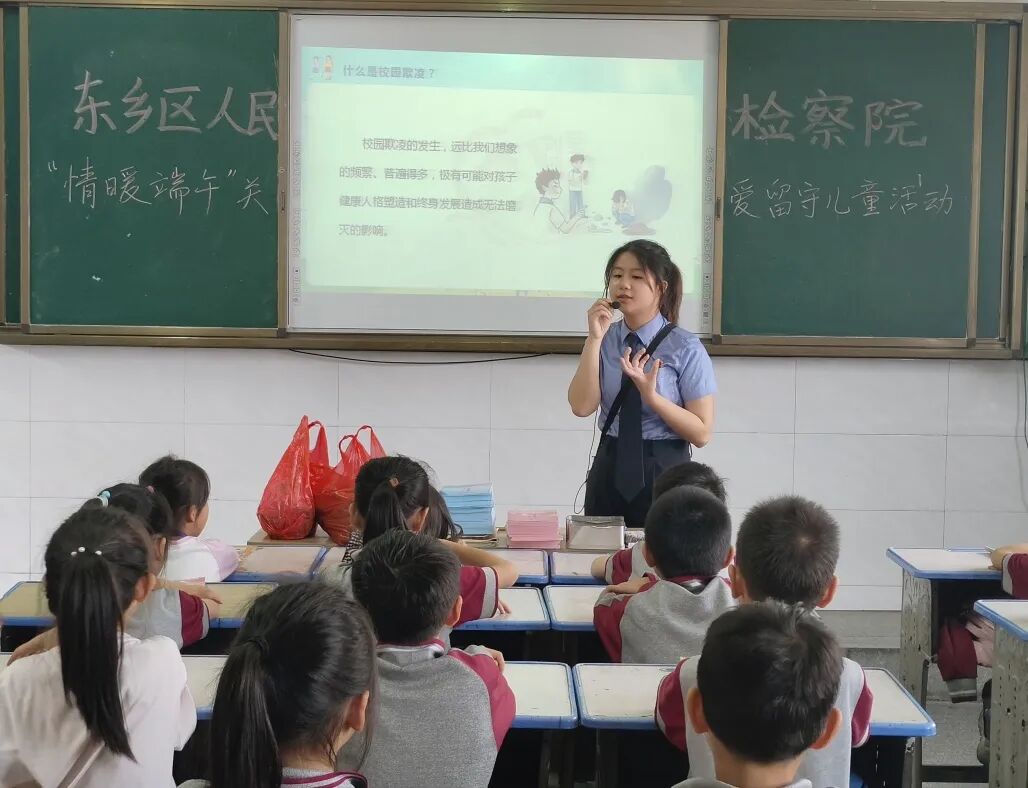 悠悠艾草香,片片粽叶长,童心逐梦飞,欢笑满堂扬。6月7日,东乡区人民检察院刘莹姐姐工作室成员走进东乡一小开展“情暖端午”关爱留守儿童活动,用爱心呵护留守儿童稚嫩的心灵。刘莹姐姐通过生动有趣的图文向同学们上了一堂生动形象的防校园欺凌法治课,并通过游戏的形式为同学们送上了香喷喷的大粽子,孩子们脸上洋溢着开心的笑容,现场欢声笑语一片。