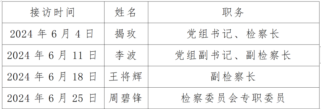 为深入贯彻习近平法治思想,践行新时代检察为民的工作理念,切实做细做实做深群众信访工作,推动案结事了人和,现将东乡区人民检察院2024年6月份检察长接访安排公告如下:
