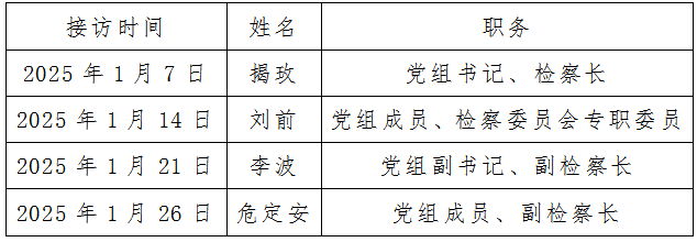 为深入贯彻习近平法治思想,践行新时代检察为民的工作理念,切实做细做实做深群众信访工作,推动案结事了人和,现将东乡区人民检察院2025年1月份检察长接访安排公告如下:
