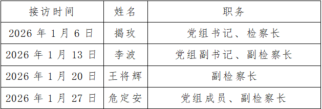 为深入贯彻习近平法治思想,践行新时代检察为民的工作理念,切实做细做实做深群众信访工作,推动案结事了人和,现将东乡区人民检察院2026年1月份检察长接访安排公告如下: