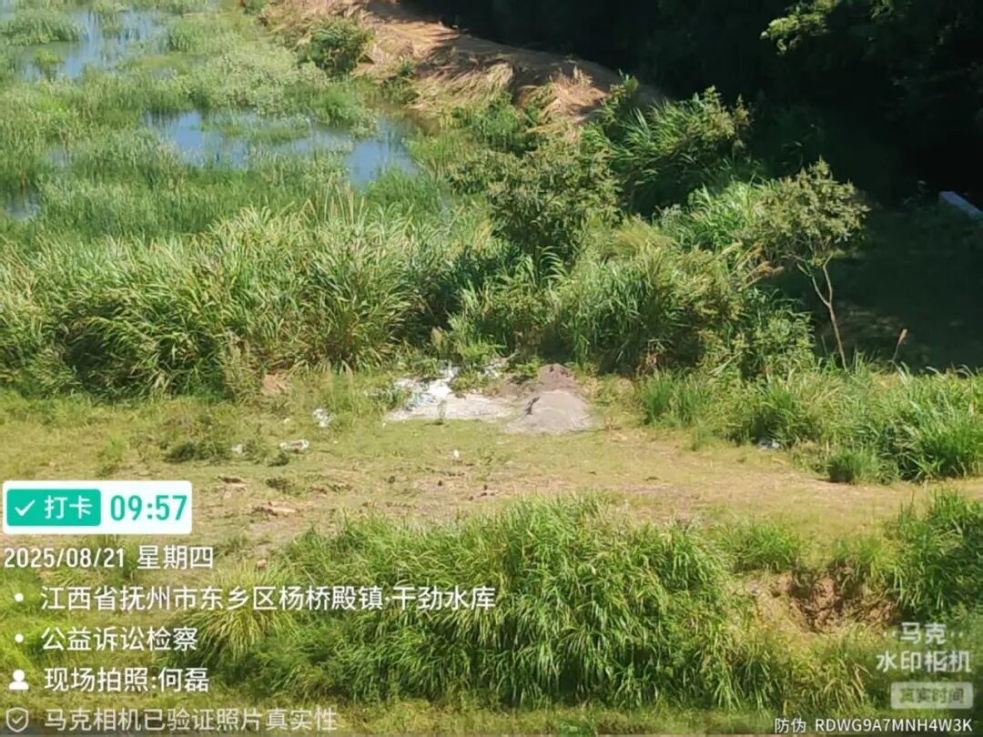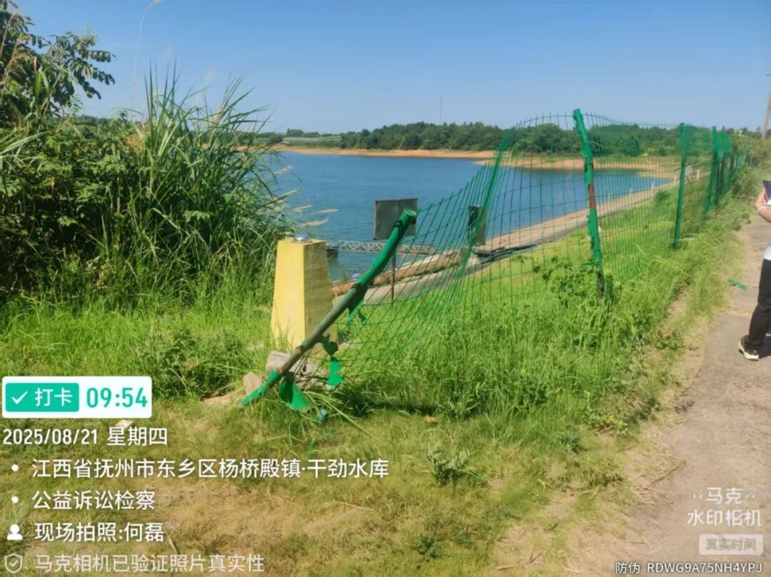 2025年8月,东乡区人民检察院在开展抚河流域生态环境公益诉讼专项监督活动中发现,杨桥殿镇干劲水库取水口两百米内堆放牛粪便,建筑垃圾倾倒在大坝上,隔离防护网多处破损,标识牌倒塌。同年9月,检察院依法向东乡生态环境局及杨桥殿镇人民政府发出检察建议,督促其履行监管职责,落实整改。
