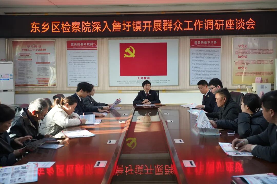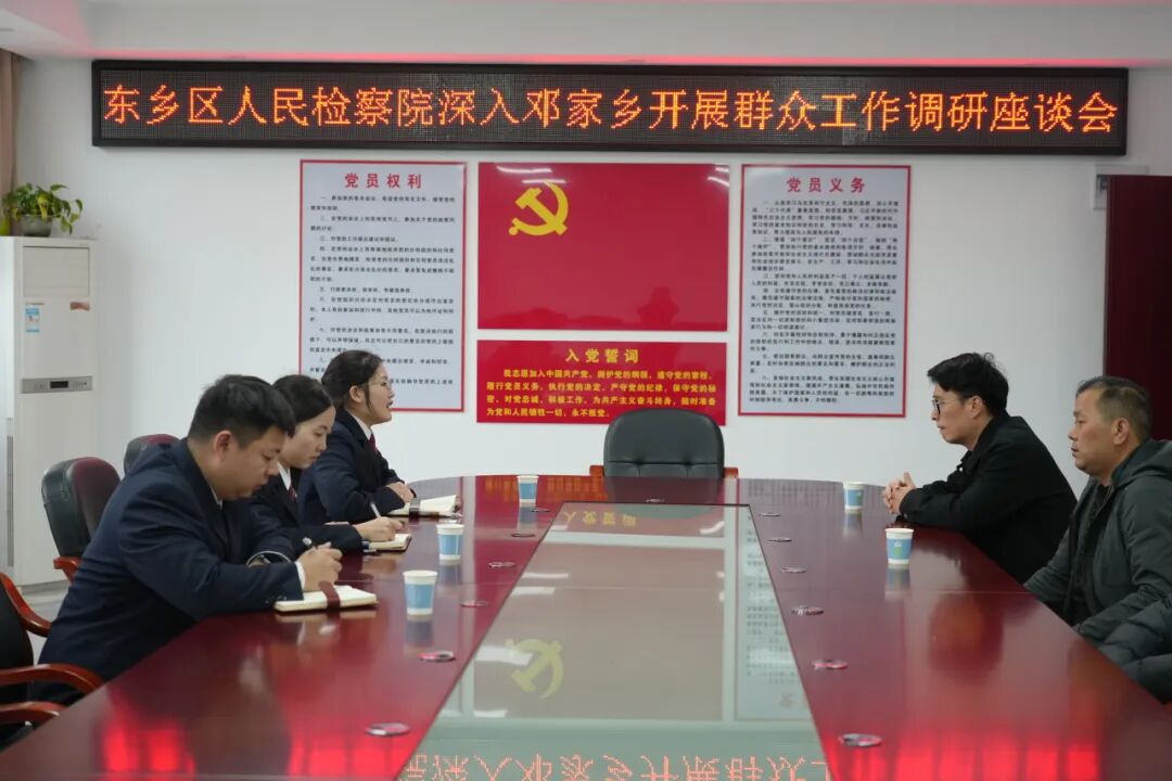 随后,干警们前往邓家乡政府,与乡镇干部、村委会负责人及部分群众代表召开了专题座谈会。会上,双方围绕乡村法治建设、矛盾纠纷化解、重点领域普法宣传等方面深入交流探讨。检察干警主动询问群众当前最为关心的法律难点问题及法治需求。乡镇干部也表示希望检察机关能进一步深入乡村,提供更精准、更灵活的法律服务。