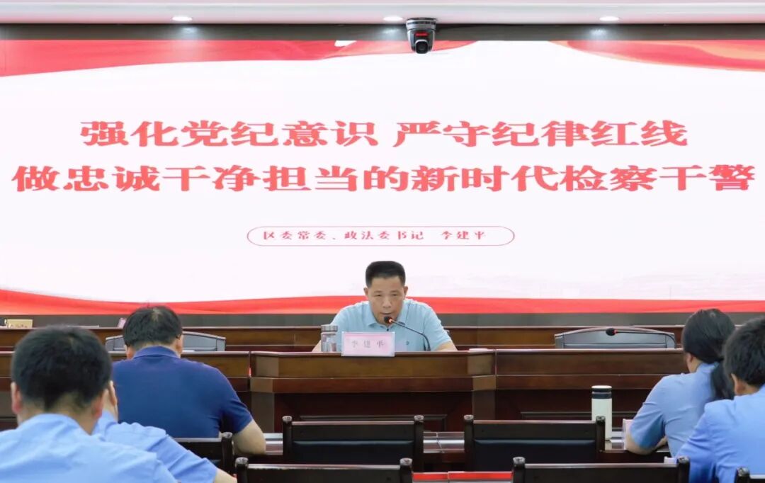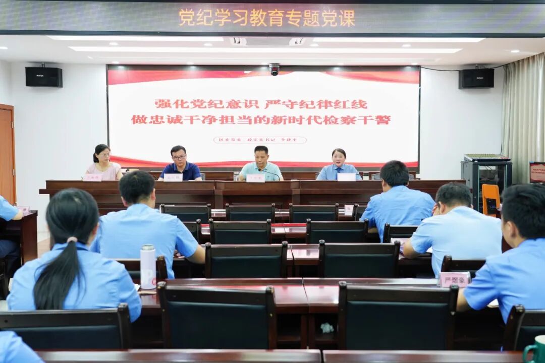 7月5日,区委常委、政法委书记李建平到区检察院调研督导党纪学习教育并讲授纪律专题党课,区检察院党组书记、检察长揭玫主持党课。