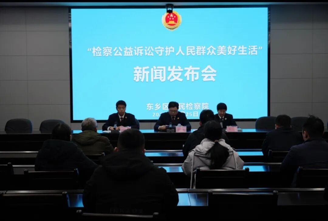 12月25日,东乡区人民检察院召开“检察公益诉讼守护人民群众美好生活”新闻发布会。区检察院党组副书记、副检察长、新闻发言人李波通报了2025年东乡区人民检察院公益诉讼检察工作情况,党组成员、检委会专职委员刘前主持会议,第二检察部主任李江龙回答参会代表提问。区融媒体中心、区林业局、区文广旅局、区生态环境局、区市场监督管理局以及群众代表受邀参加。